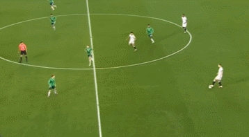 这一次也是一样的道理,施洛特贝克的直塞球找到中锋沃尔特马德,这一脚传球恰好穿透了北爱尔兰的高位逼抢。