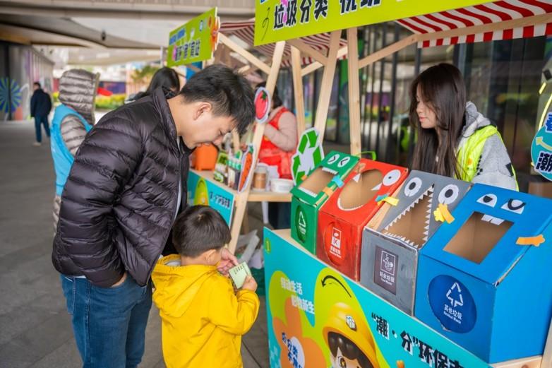 市集另一侧的 “趣味游戏区” 更是人气爆棚。最受小朋友欢迎的当属 “分类套圈圈” 。圈圈里摆放着代表不同垃圾类别的桶锥 —— 塑料瓶玩偶代表可回收物,果皮玩偶代表厨余垃圾,电池玩偶代表有害垃圾。“套中哪个,就要说出它属于什么垃圾哦!” 志愿者耐心引导,小朋友们排着队跃跃欲试。5 岁的萌萌套中了塑料瓶玩偶,大声回答 “可回收物”,并顺利赢得一枚 “潮分市集兑换奖章”,她攥着奖章蹦蹦跳跳地跑到妈妈身边炫耀:“妈妈你看!我会垃圾分类啦!” 阳光下,孩子们的欢笑声与徽章的金属光泽交相辉映,将环保种子悄悄种进了童年记忆里。